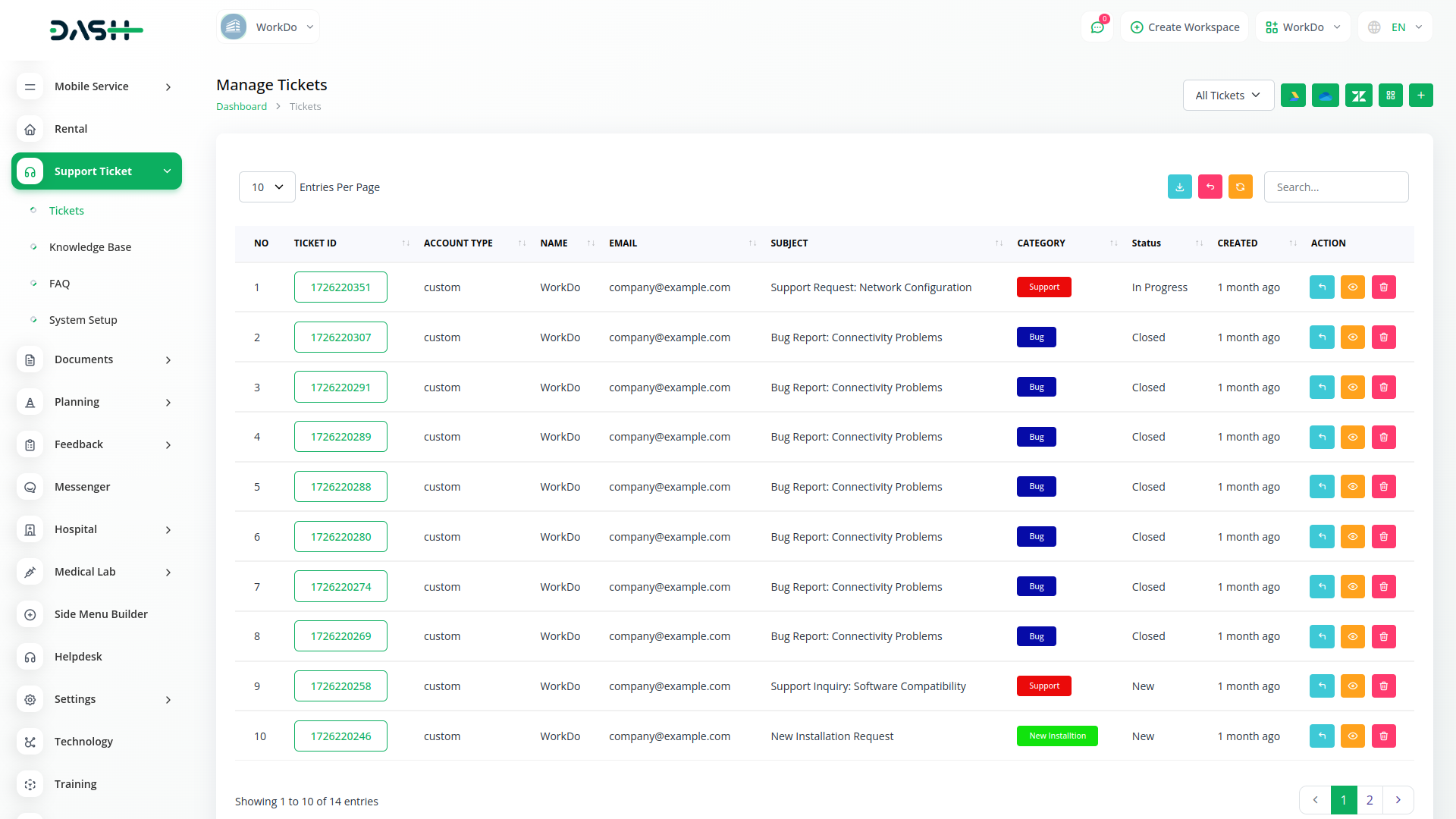 Add new tickets as and when required. Get a detailed list of all the generated tickets with their respective ticket IDs, categories, subject, status, and essential information. Edit them by adding a new response or changing the status with a simple click.